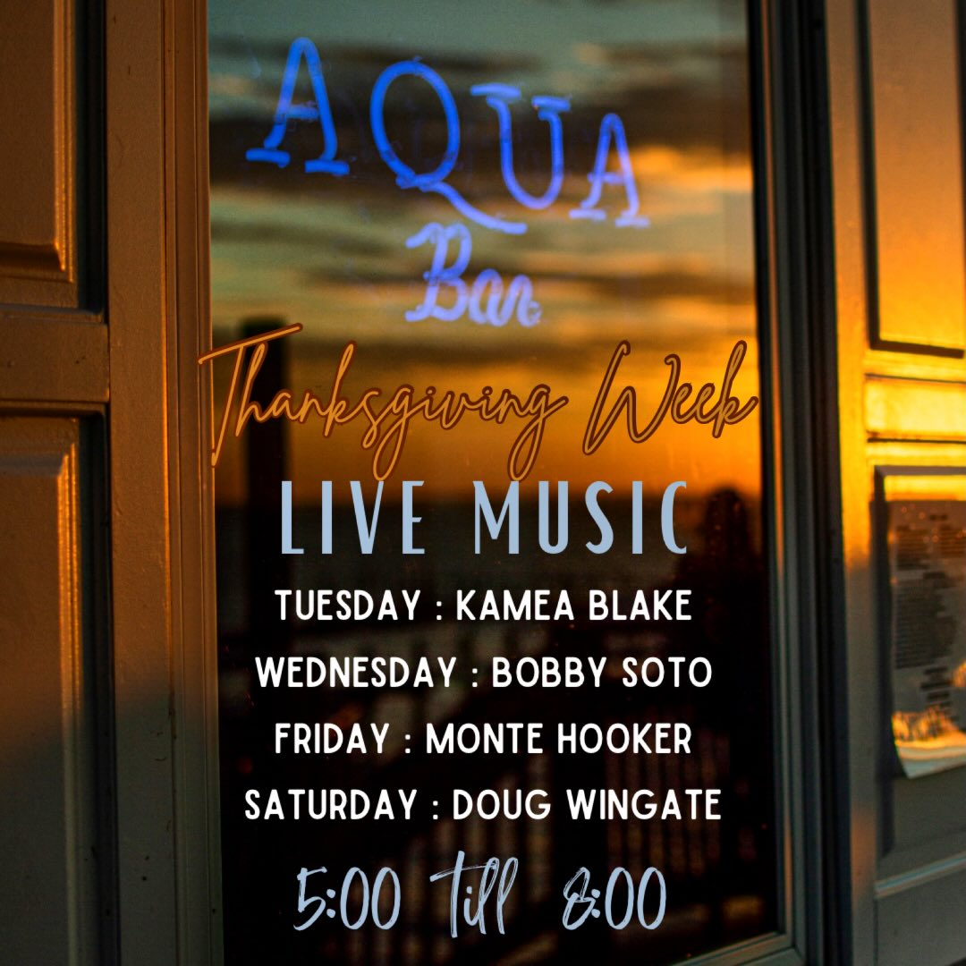 Celebrate Thanksgiving week at AQUA with live music in the bar every evening, Tuesday through Saturday, 5–8pm. Relax, sip, and enjoy the soundside views. ✨