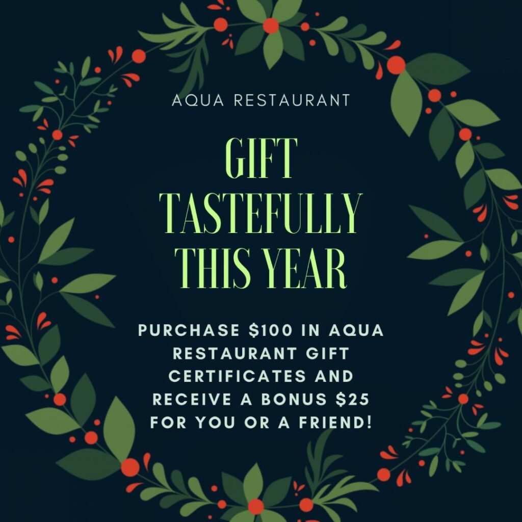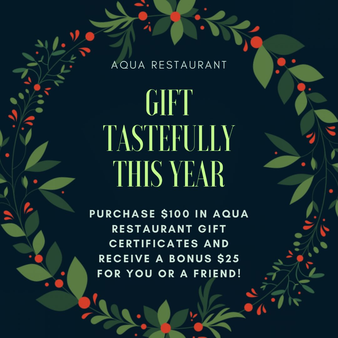 Purchase $100 in Aqua gift certificates and receive a bonus $25 for you or a friend!
